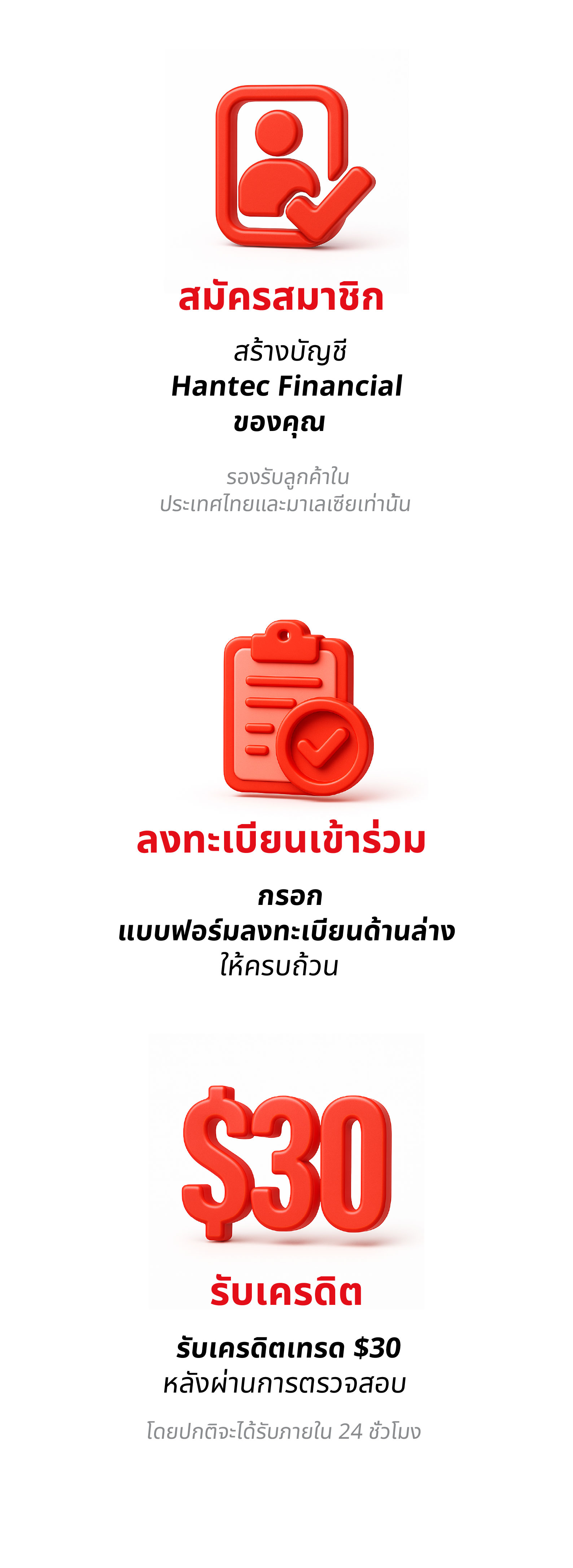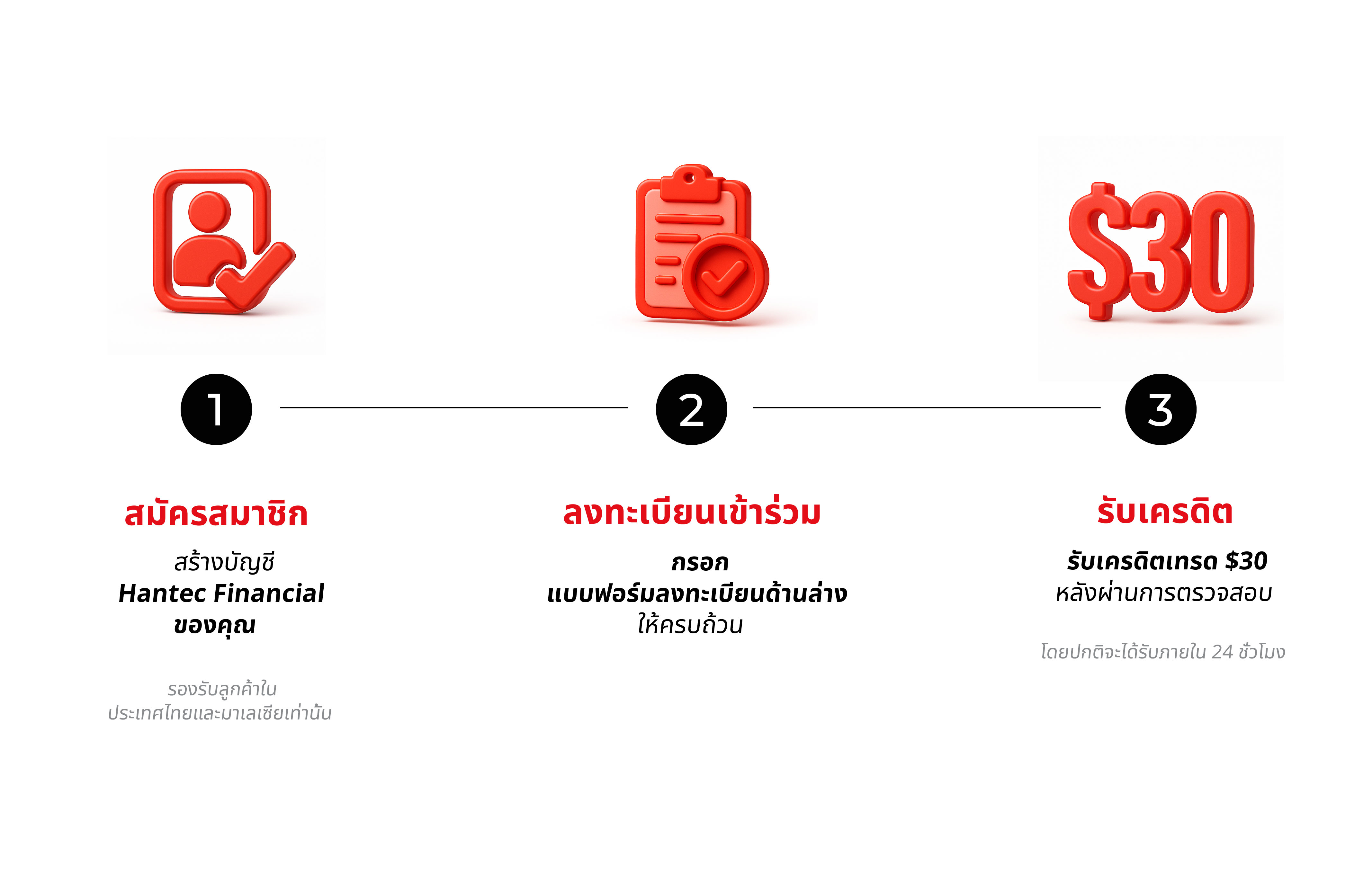ผู้เข้าร่วม: ลูกค้าใหม่ของ Hantec Financial ใน ประเทศไทยและมาเลเซีย มีสิทธิ์เข้าร่วมแคมเปญนี้