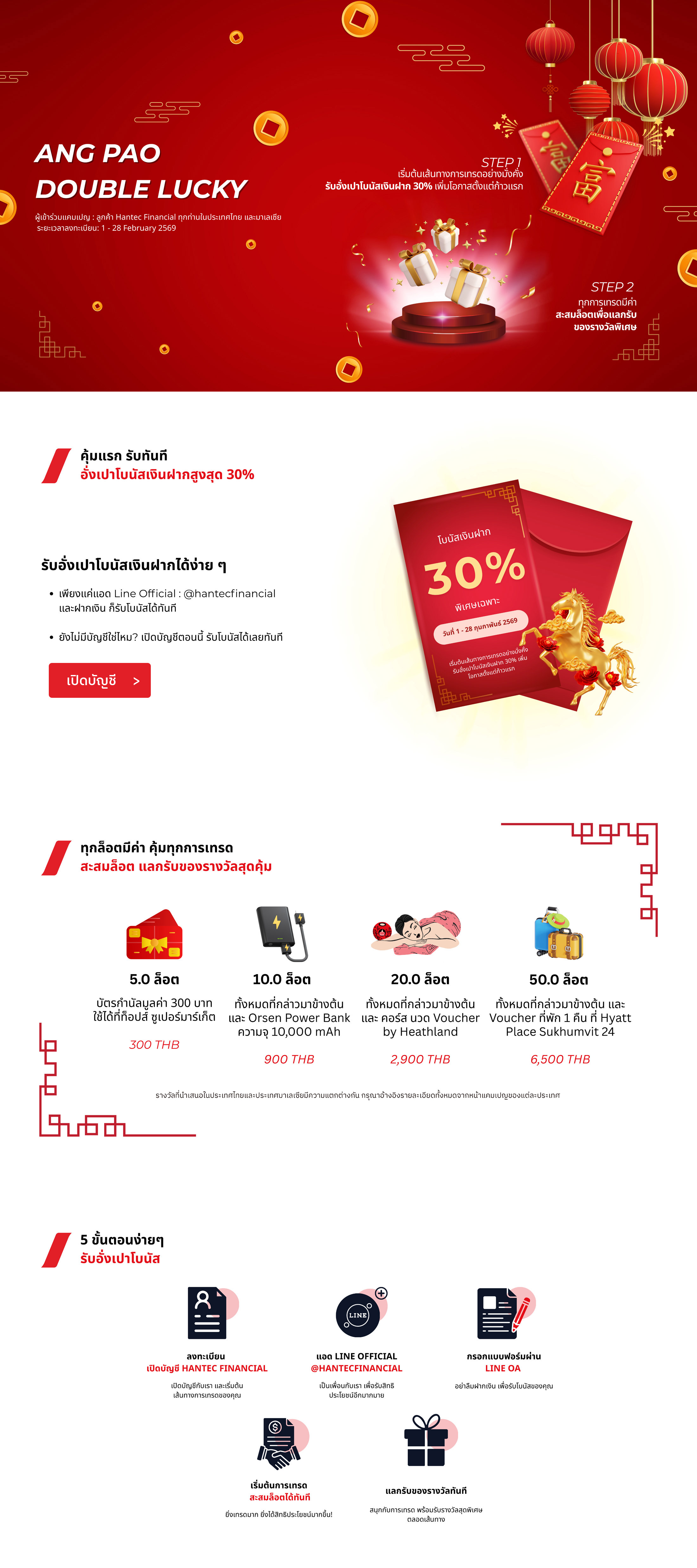 สำหรับตลาดประเทศไทย: หลังจากเพิ่มบัญชี LINE OA อย่างเป็นทางการของ Hantec Financial Thailand และกรอกแบบฟอร์มลงทะเบียนภายใน LINE OA เรียบร้อยแล้ว ลูกค้าที่มียอดการเทรดแบบปิดสถานะ (Closed Lot) ครบตามเงื่อนไขที่กำหนดภายในระยะเวลาโปรโมชั่น (ไม่รวมผลิตภัณฑ์หุ้นสหรัฐฯ) จะมีสิทธิ์รับรางวัลตามระดับรางวัลที่กำหนด